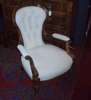 the button upholstered back crested by a swagged oval patera above leaf and ribbon carved outscrolling padded arms and bowed seat on gadrooned and fluted tapering legs headed by fielded capitals, on ceramic castors the seat rail stamped Holland & Sons