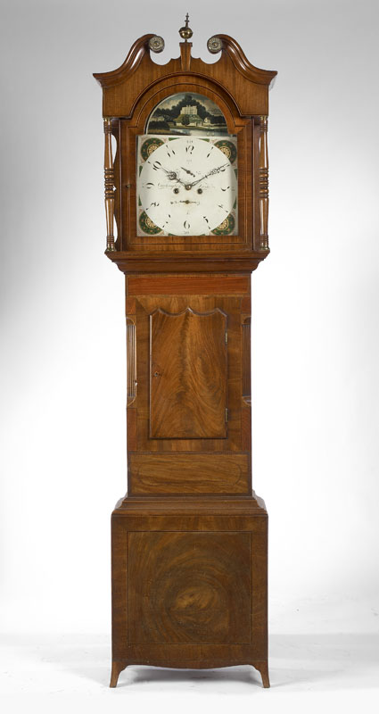 the twin train movement striking the hours on a bell, swan neck pediment above a painted Roman dial with subsidiary calendar and seconds, with a sailing ship in moonlit waters to the arch, the bowed trunk door with acorn finial between pilasters, on shaped apron and bracket feet