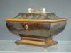 of sarcophagus form, on gilt ball feet, with mother of pearl and ivory fittings and fitted interior