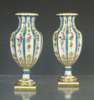 each urn shaped, with fluted panels of flowers, blue and gilt borders, and blue painted mark (2)