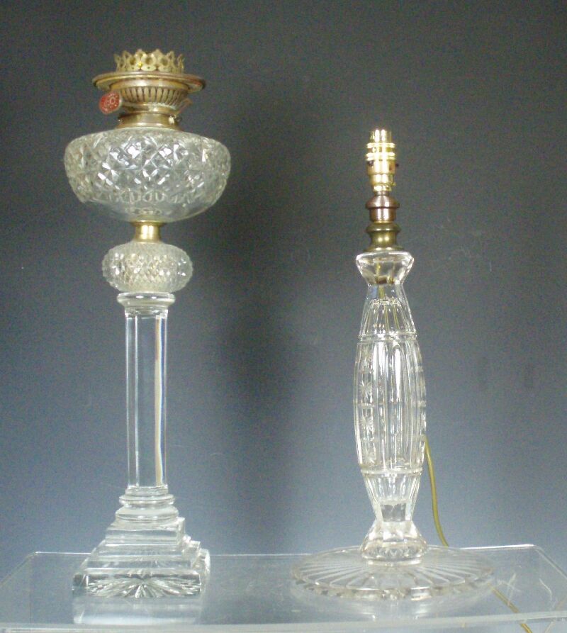 the cut glass well above hexagonal column and square graduated base, 54cm high; a cut glass lamp with ovoid column and plain foot, 35cm high, a globular shaped cut glass lamp shade, 14cm high; and a shaped circular clear and amber glass shade with etched swans, 14cm high (4)
