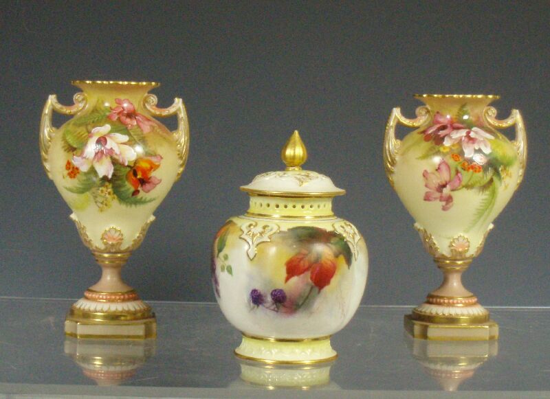 with twin handles with wildflowers and bracken on a blushed ivory ground, green control marks, for 1902, 1903, shape mark, 1959, 15cm high; and a Hadley ware vase and cover of ovoid form with wildflowers and brambles, with indistinct control mark, 12cm high (3)