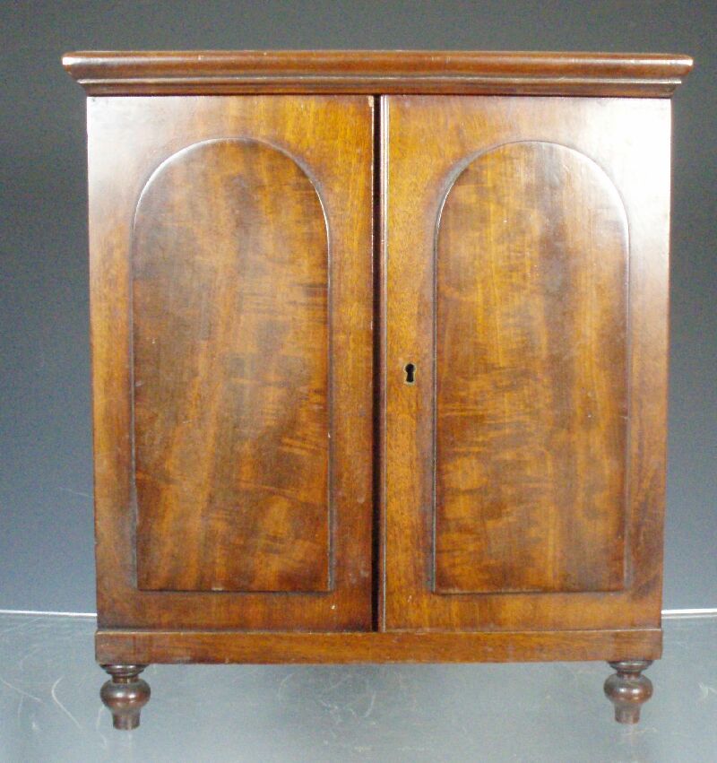 reeded corners, arched panel doors and bun feet, enclosing three columns of drawers, 32cm wide, 36cm high, 20cm deep; and a 19th century miniature mahogany apprentices chest, with two short and three long drawers and serpentine apron, 34cm wide, 36cm high, 14cm deep (2)