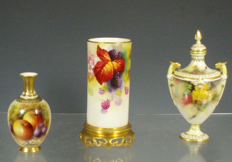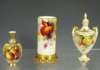 with brambles and wildflowers on an ivory ground with gilt, puce control mark, for 1936, shape mark, 6/161, 16cm high; an ovoid vase, painted by H. Ayrton, with apples and grapes on an ivory ground with gilt, puce control mark, for 1931, shape mark, 286/H, 11cm high; and a Hadley ware twin handled urn shaped vase, with roses on an ivory ground with gilt, light green control mark, for 1906, 16cm high (3)