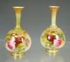 each with frilled flared rim above slender neck and globular body, the shoulders pierced and with moulded scroll decoration, the body painted with roses, puce printed mark, date code for 1905, shape number G991 (2)