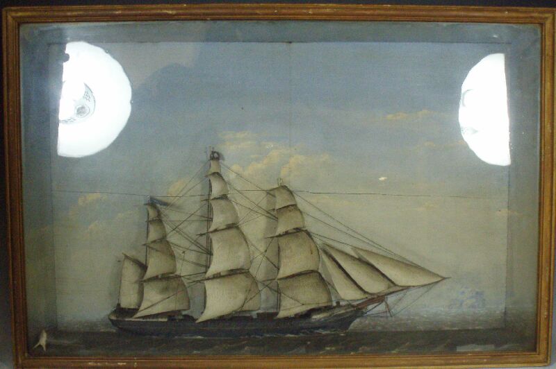 depicting a half model of a square rigged ship within a naturalistically painted seascape