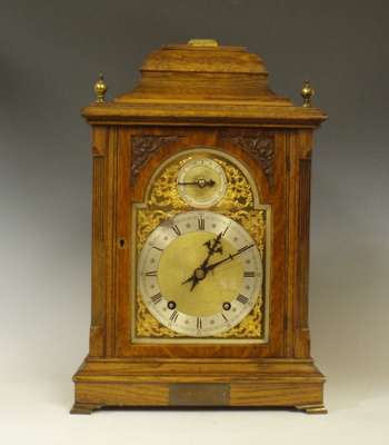 the case of caddy form surmounted by brass finials over foliate carved panels to front and sides on bracket feet, the gilt dial with silvered chapter ring with black roman numerals
