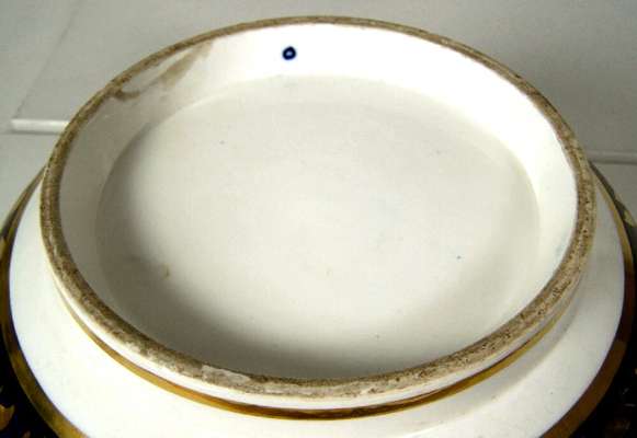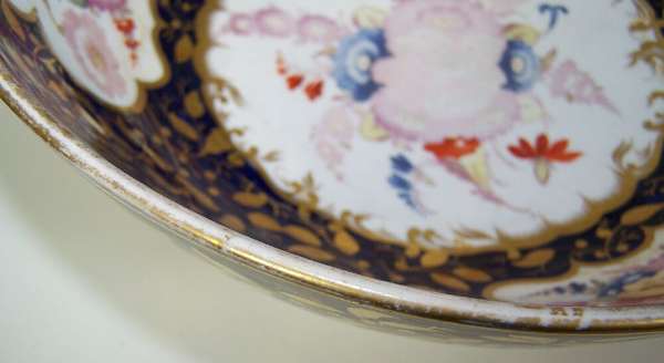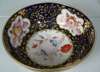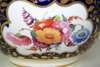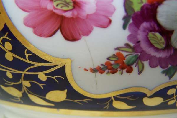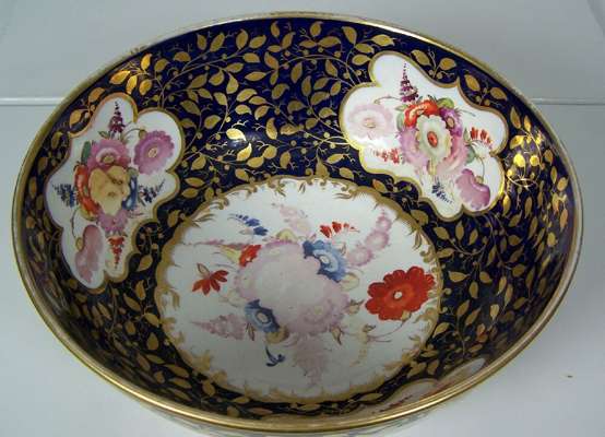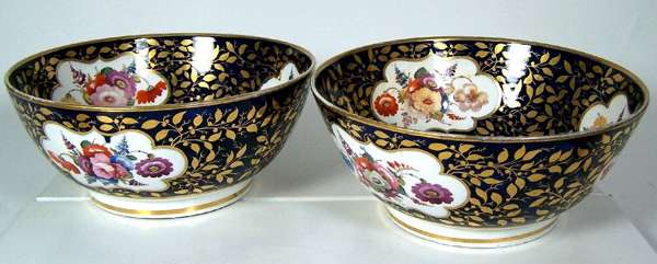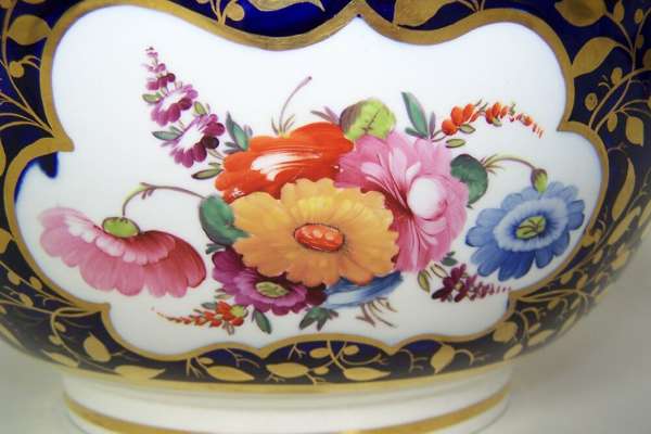 each decorated with gilt foliage on a dark blue ground, with cartouche panels to the interior and exterior sides, painted with polychrome summer flowers, the well similarly painted (2)
