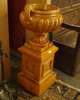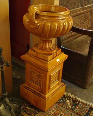 each of gadrooned campana form with pierced scroll handles above fluted socles, on panelled square section pedestals with leaf patera decorated sides and plinth bases (2)