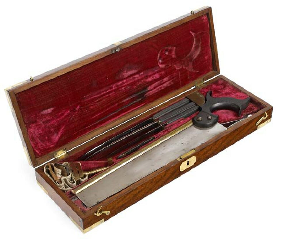 the mahogany brass bound case opening to reveal a plush compartmented interior fitted with ebony handled stainless steel tools
