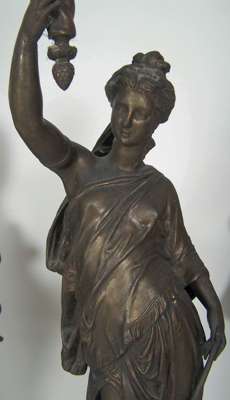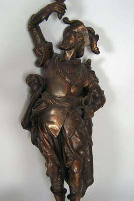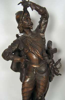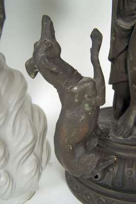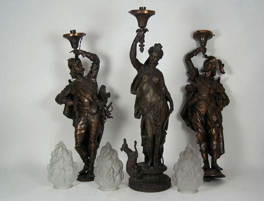 each modelled as a bearded cavalier, holding aloft a light fitting with flame moulded glass shade, on circular base, 83cm high; and another similar, modelled as Diana, with bow and hound, 86cm high (3)