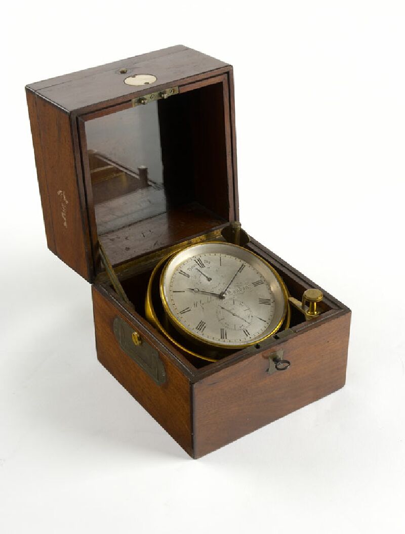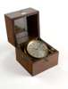 the glazed two section cover with recessed brass carrying handles enclosing a gimbal mounted silvered dial with roman numerals, subsidiary seconds and up/down dial, with retaining screw, signed on the dial
