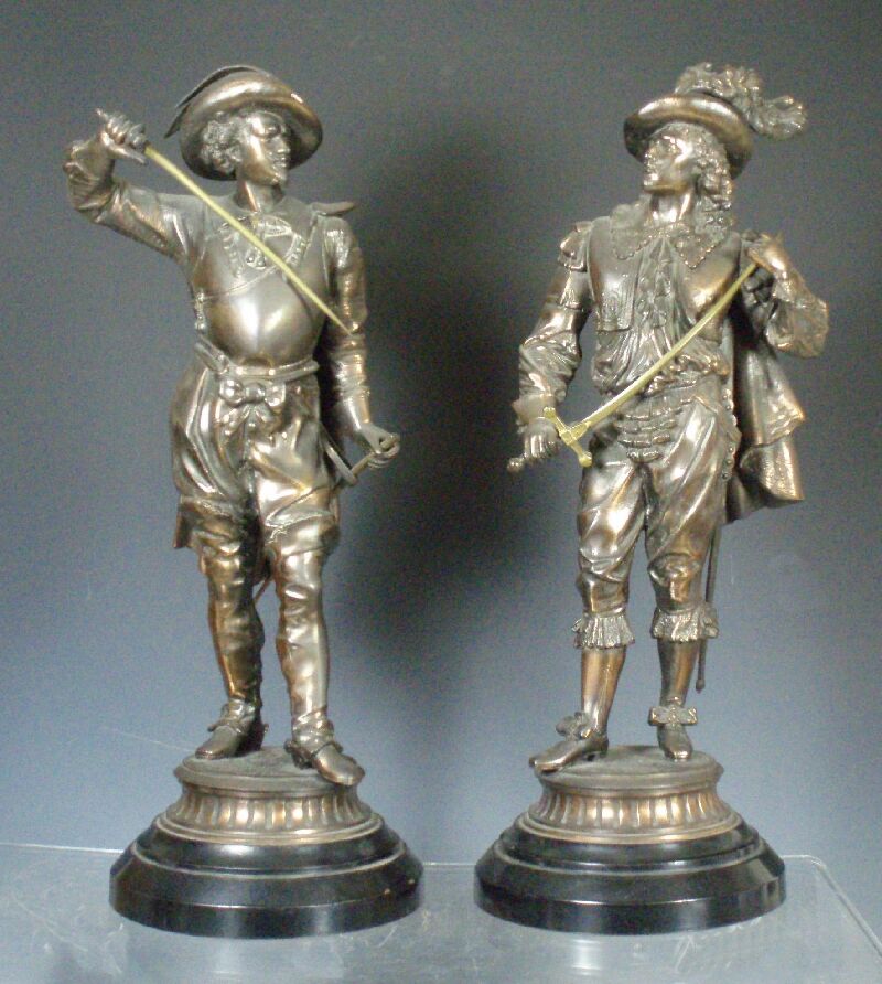 A pair of 19th century French copper patinated spelter 'Musketeer' figures