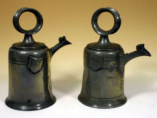 each cover with ring handle, applied shields enraved letters 'I.S.T.' and 'K.G.', marks to spout cover