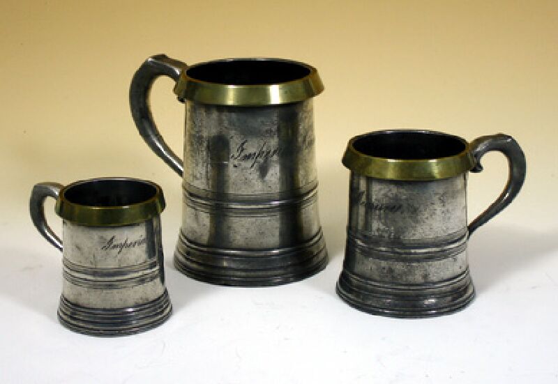 Three Victorian graduated brass bound pewter measures signed Walter Parry