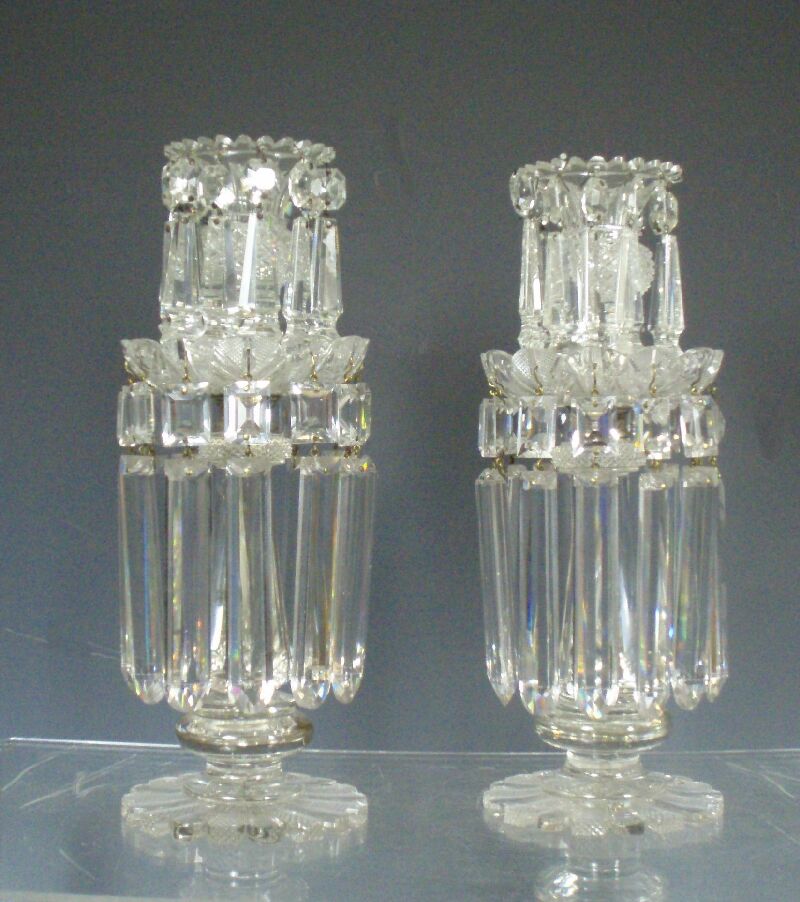 each with two layers of lustres, below a shaped bowl with knopped stem over a shaped foot