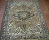 the rust brown field with central indigo and rust medallion suspending pendants, ivory spandrels, within indigo turtle palmette border between bands