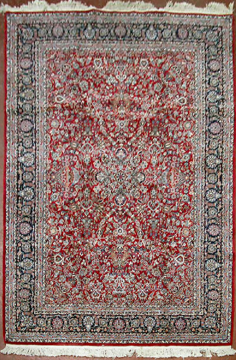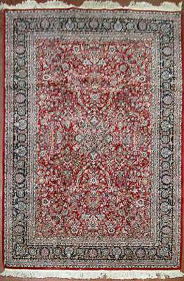 the red field with allover palmette, floral and foliate vine pattern, within indigo palmette and foliate vine border between blue and ivory bands