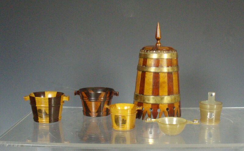 with scenes of Alloway Kirk, 10cm wide; Burns monument, 8cm wide; and the Atholl Plantations, Dunkeld, 10cm wide; a horn quaich set with citrines, 10cm wide; a horn bucket, 4cm high; and a staved and brass bound circular box and cover, 21cm high (6)
