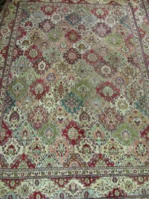 the field with allover polychrome palmette lattice, within similar border between cream bands