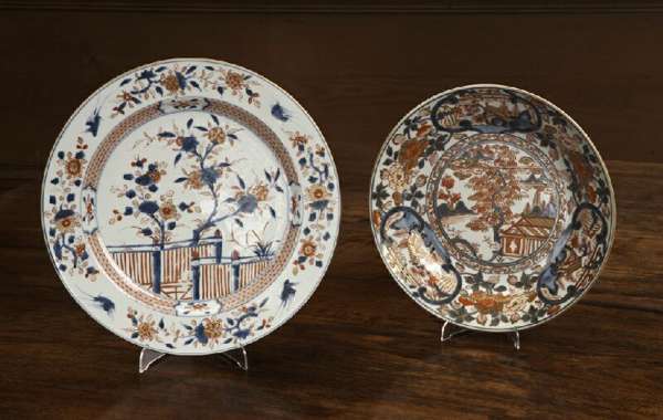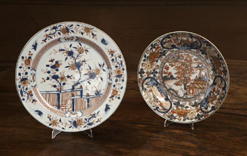 with flower sprigged border, the well with blossom trees and fence, 35cm diameter; and a Chinese Imari plate, profusely decorated with cartouche panels to the border, a building and trees to the well, six character mark, 31cm diameter (2)