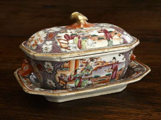 An early 19th century Chinese famille rose sauce tureen, cover and stand