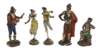 of a dancing couple, on domed plinth, 33cm highest; another taller matched pair of male musicians, 35cm highest; and a seated musician (5)