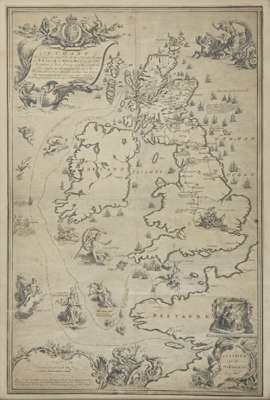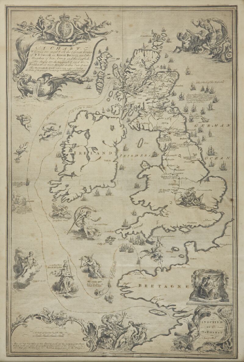 bears heading, “A Chart Wherein are marked all the different routes of P Edward in Great Britain, and the Marches of ? Army and the English ………..”, within a later ebonised frame