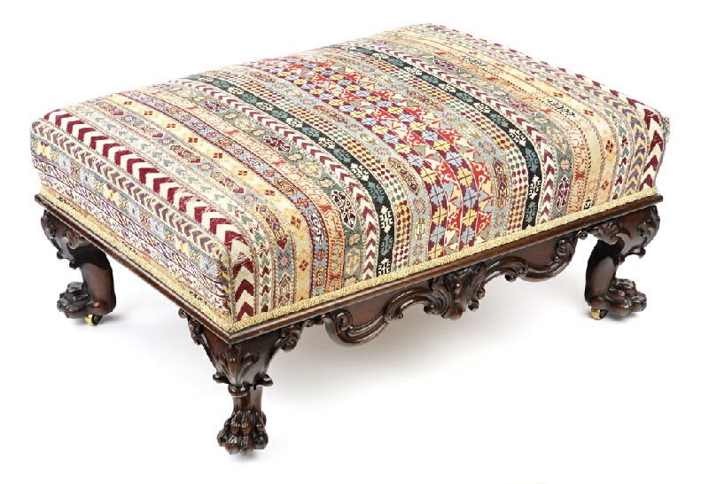of serpentine form, on moulded cabriole legs, 40cm long; and another stool with X legs (2)