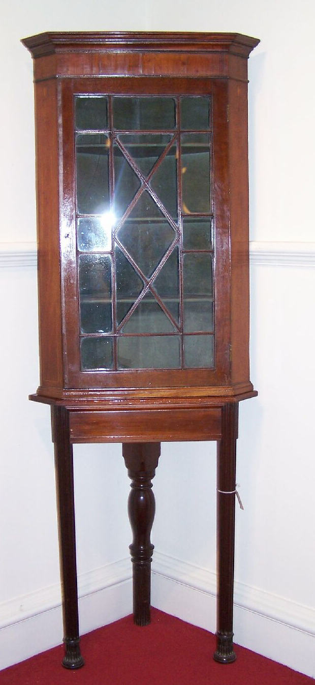 the moulded cornice above an astragal glazed door enclosing three shelves, the corners inlaid with stringing, 76cm wide, 112cm high; together with an associated later mahogany stand, 92cm high (2)