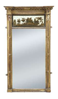 the inverted breakfront ball moulded cornice above a reverse glass panel of a castle on a hillside, below is a mirror panel flanked by cluster column pilasters (elements lacking)