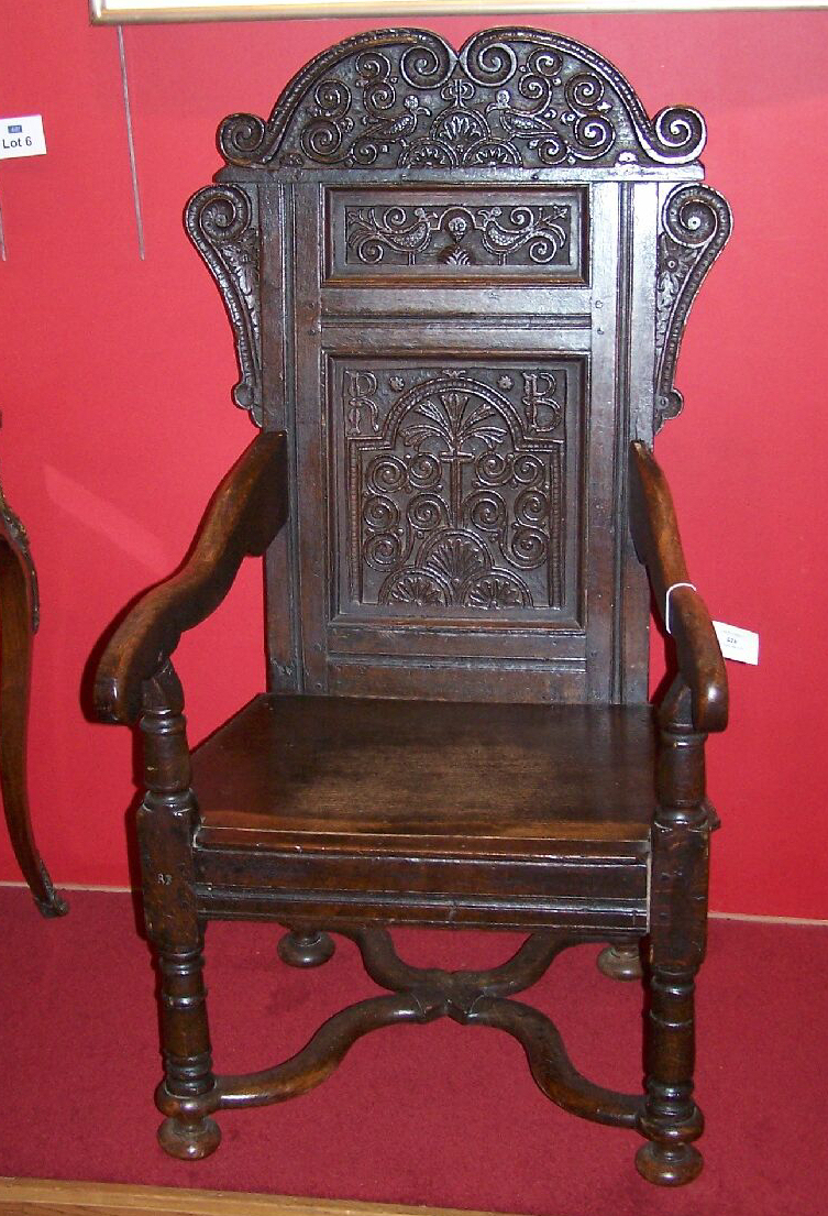 probably Yorkshire, the arched scroll cresting with two birds above lower conforming panel and a larger arched scroll panel initialled ‘RB’, the downswept arms above a solid seat and turned legs (feet and stretchers replaced)