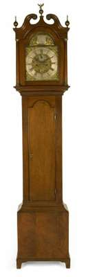 the twin train movement with anchor escapement striking the hours on a bell, the swan-neck pediment with brass finials above a floral engraved brass dial with subsidiary seconds dial, calendar aperture and rococo cast spandrels, the arched trunk door above an apron base, on bracket feet