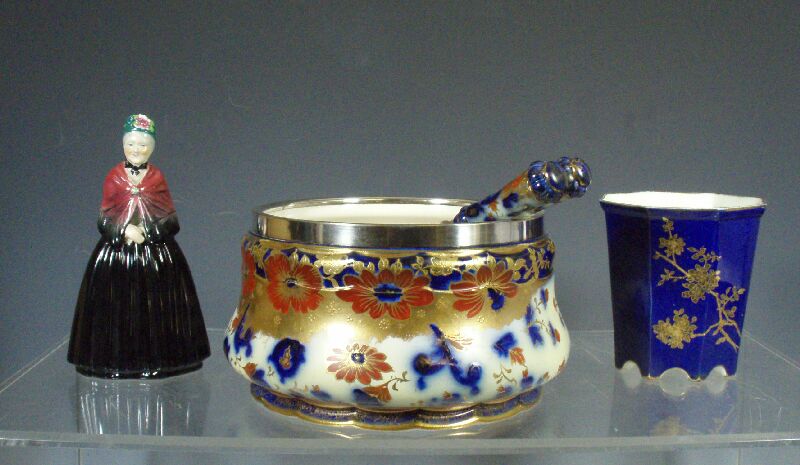 comprising: a figure of a lady in black and red 'Grandma' pattern, 4276, 18cm high; a salad bowl bound by white metal and a pair of servers 'Marguerite' pattern, W & R mark, 20cm wide; and a blue and gilt flower pot 'Lovebirds' pattern, W & R mark (5)
