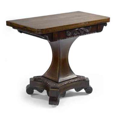 the rounded rectangular swivel top above a leaf scroll carved frieze with beaded edge on a waisted square section pillar and a gadrooned laurel leaf carved concave platform base, raised on scroll feet and castors
