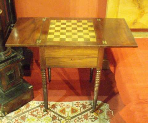 the rectangular top with a pair of leaves opening to reveal brass fly arm supports and a sliding chess board with fitted interior compartments and baize inset verso, the frieze with a single drawer, simulated as two, opposed by two simulated drawers, on tapering bobbin turned legs with brass socket castors