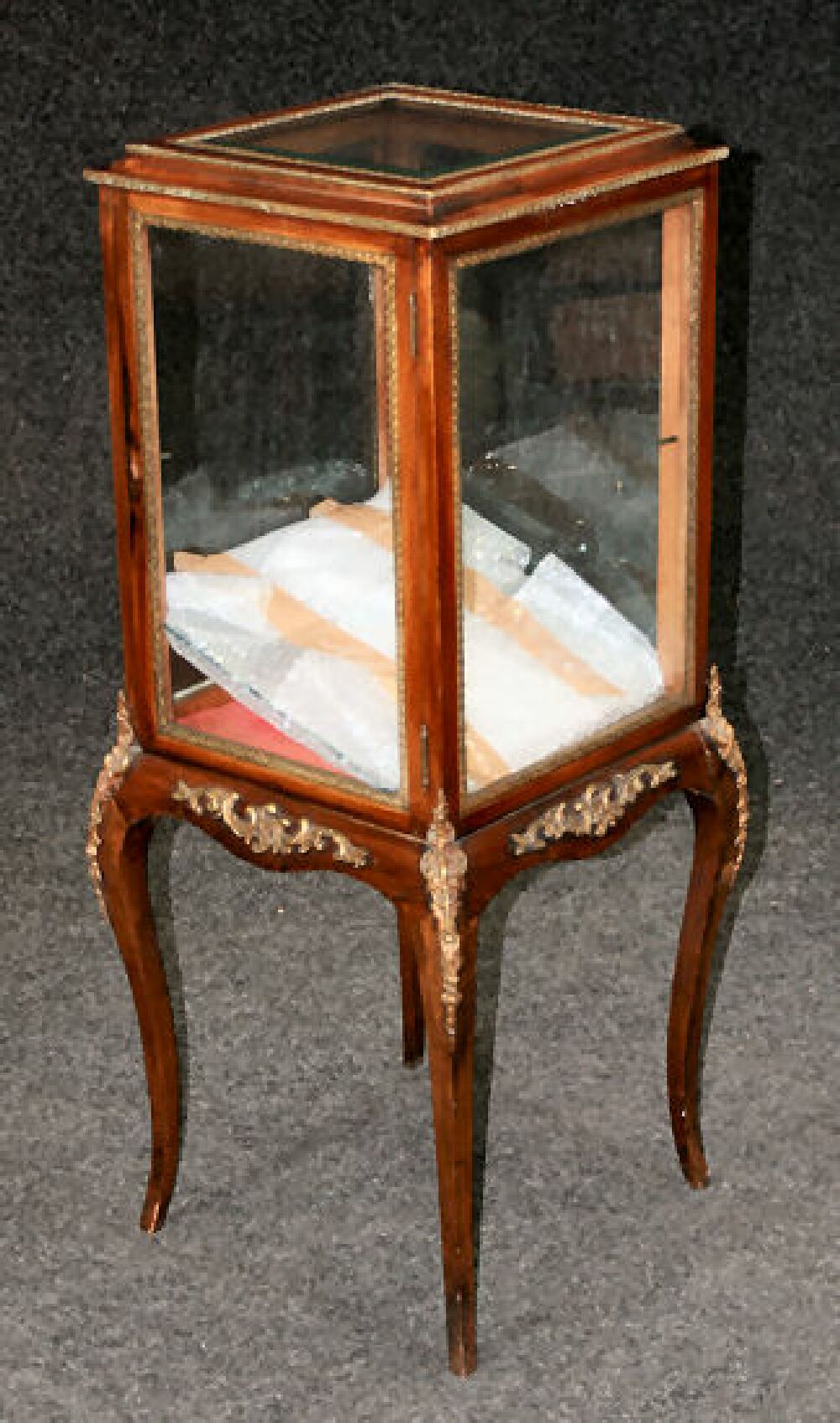 the cavetto top with glass panel above glazed sides enclosing a door, framed throughout with foliate cast gilt metal bandings, on a shaped apron and cabriole legs with rococo cast mounts