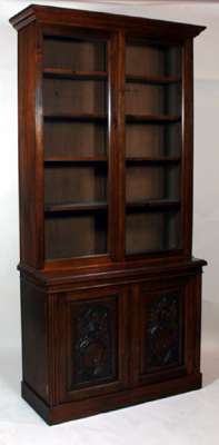the projected moulded cornice over two glazed doors enclosing shelves two thistle and shield carved doors raised on plinth base