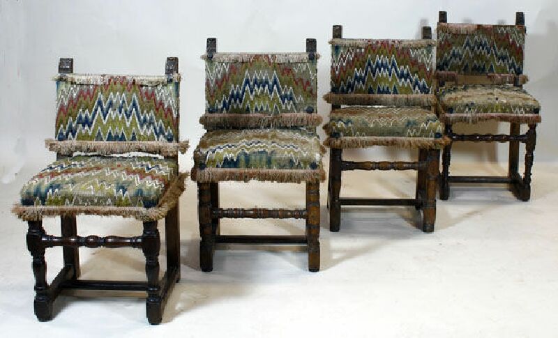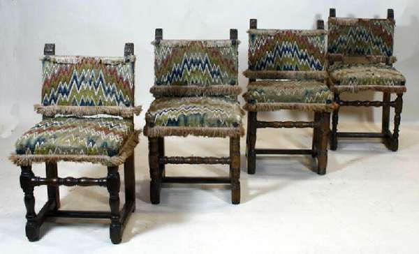 eached with acanthus carved uprights, over cushioned back and seat raised on block and turned legs united by stretchers, (4)
