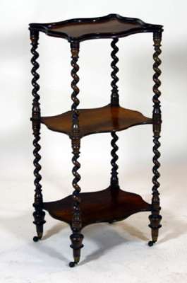the reeded serpentine top over two further matching shelves, barley sugar twist supports, brass caps castors