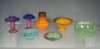 comprising: a bowl, green rising to blue, 9cm wide; a bowl, green rising to purple and blue, label, 9cm wide; a bowl, green with aventurine, 12cm wide; a footed vase, orange rising to deep purple, 11cm wide; and ovoid vase with inswept neck, orange rising to brown and aventurine, 9cm high; and a pair of miniature candle holders with everted rim, purple rising to blue, 8cm high (7)