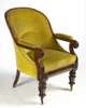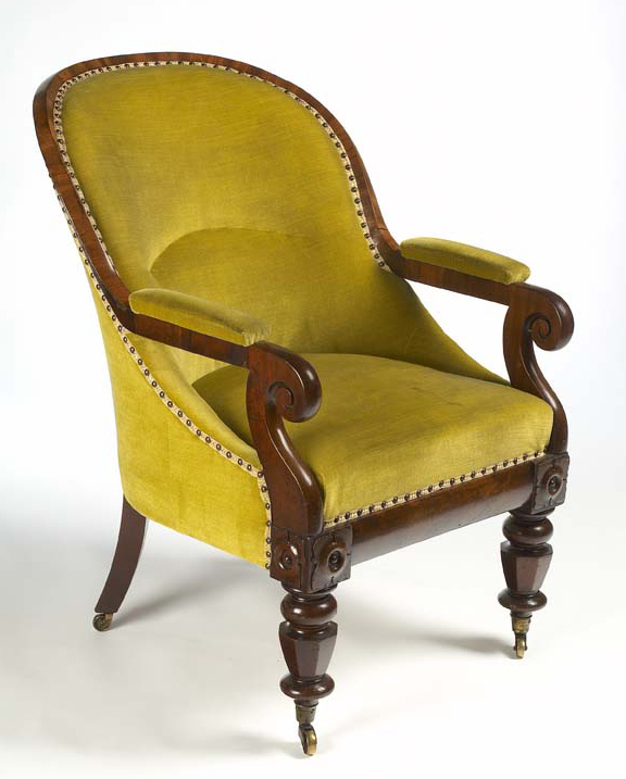 the rounded rectangular back above outscrolling arms, on short faceted legs headed by rosettes and ending in brass socket castors