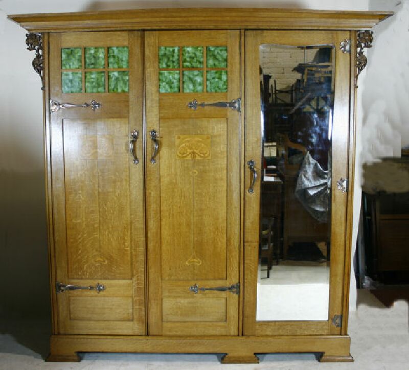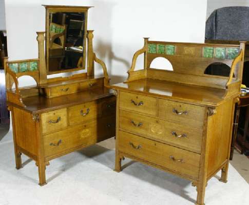 the wardrobe with projected moulded cornice over three doors one mirrored two with green tiled panels over rose design inlay with copper hinges, raised on bracket feet;217cm wide, 210cm high, 61cm deep; the dressing chest of similar design with off set rectangular mirrored plate with green tiled panels to the left, over moulded top three deep short drawers one long drawer raised on block feet 121cm wide, 169cm high, 54cm deep; the chest with green tiled three quarter gallery over two short over two long drawers raised on block feet, 107cm wide, 130cm high, 58cm deep, (3)
