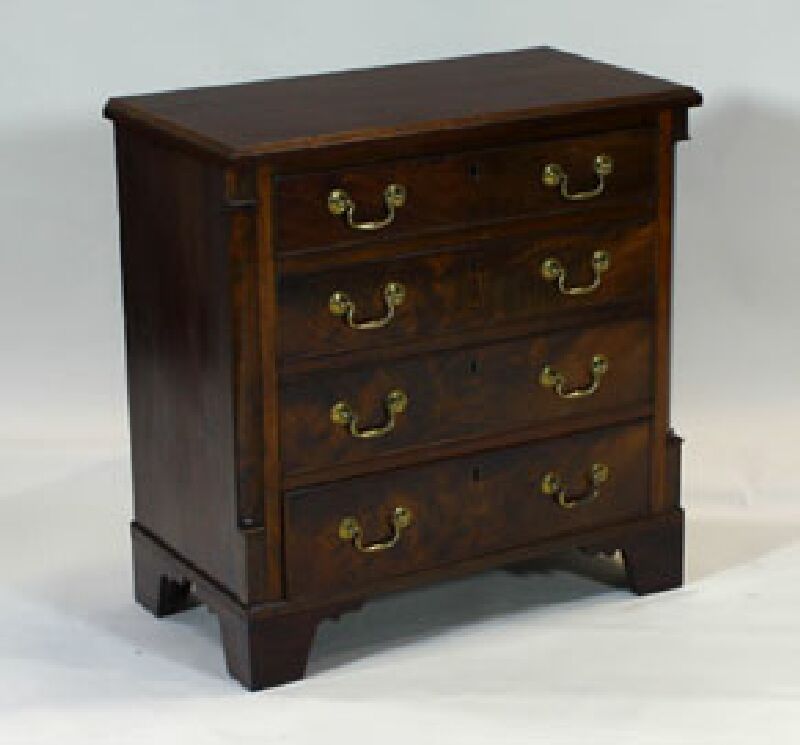 the moulded rectangular top over four graduated long cock-beaded drawers flanked by pilaster raised on bracket feet