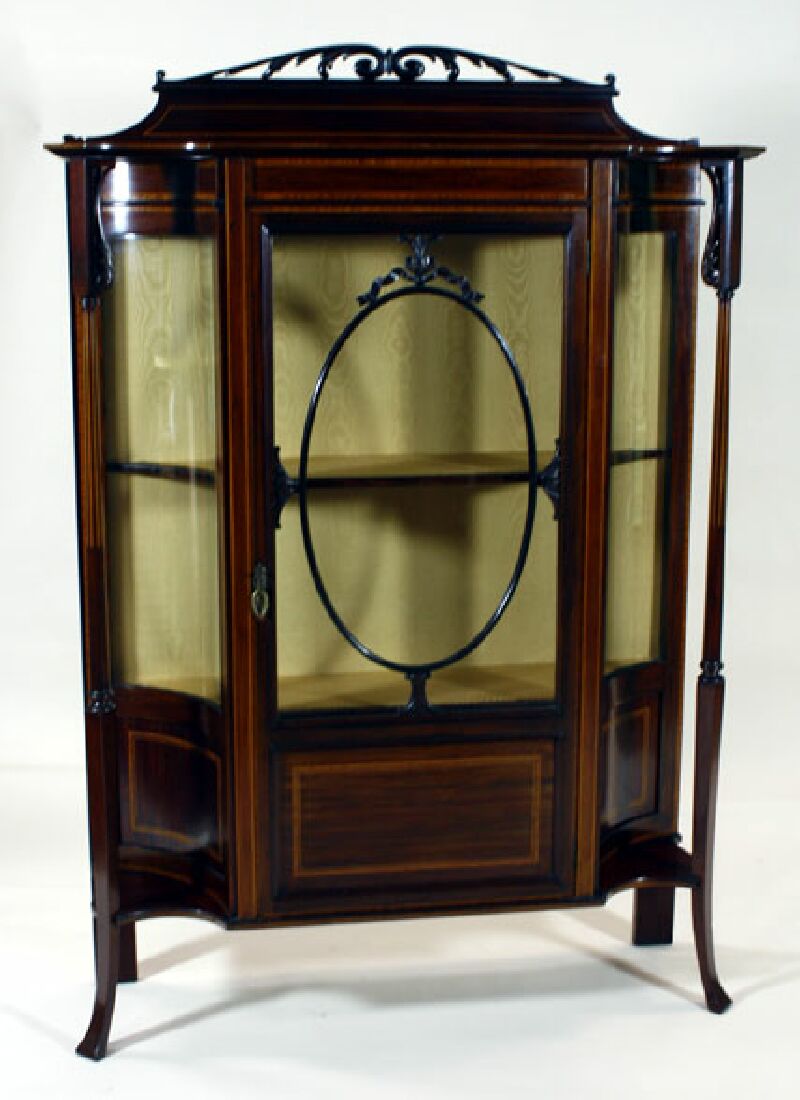 the pierced foliate carved gallery over satinwood banded frieze panel, glazed door flanked by concave glazed side panels, tapering supports, raised on splayed square legs