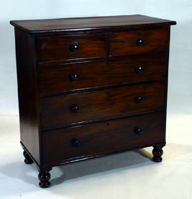 rectangular top over two short cock-beaded drawers over three graduated long drawers raised on turned legs