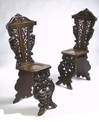 the leaf-pierced tapering backs with profiles of caryatids surmounted by scroll carved crestings, the dished seats on similarly carved legs centred by cartouches and grotesque masks (2)