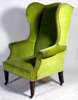 the arched back over out stretched arms pad seat covered in light green velour, raised on readed square tapering legs, brass caps and castors