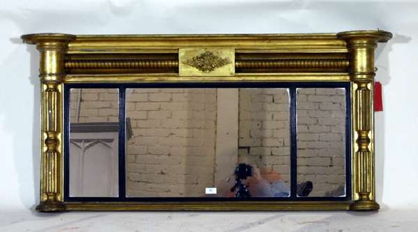 the projected moulded cornice with ring turned frieze and central cartouche, the three glass plates with ebony slips flanked by reeded columns