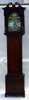 the twin train movement with anchor escapement, the swan neck pediment over a blind fretwork frieze, brass and silvered roman and arabesques dial, signed , with rococco spandrels, the floral engraved center with subsidiary seconds and calendar dials, the plain trunk door above plain base shaped apron bracket feet